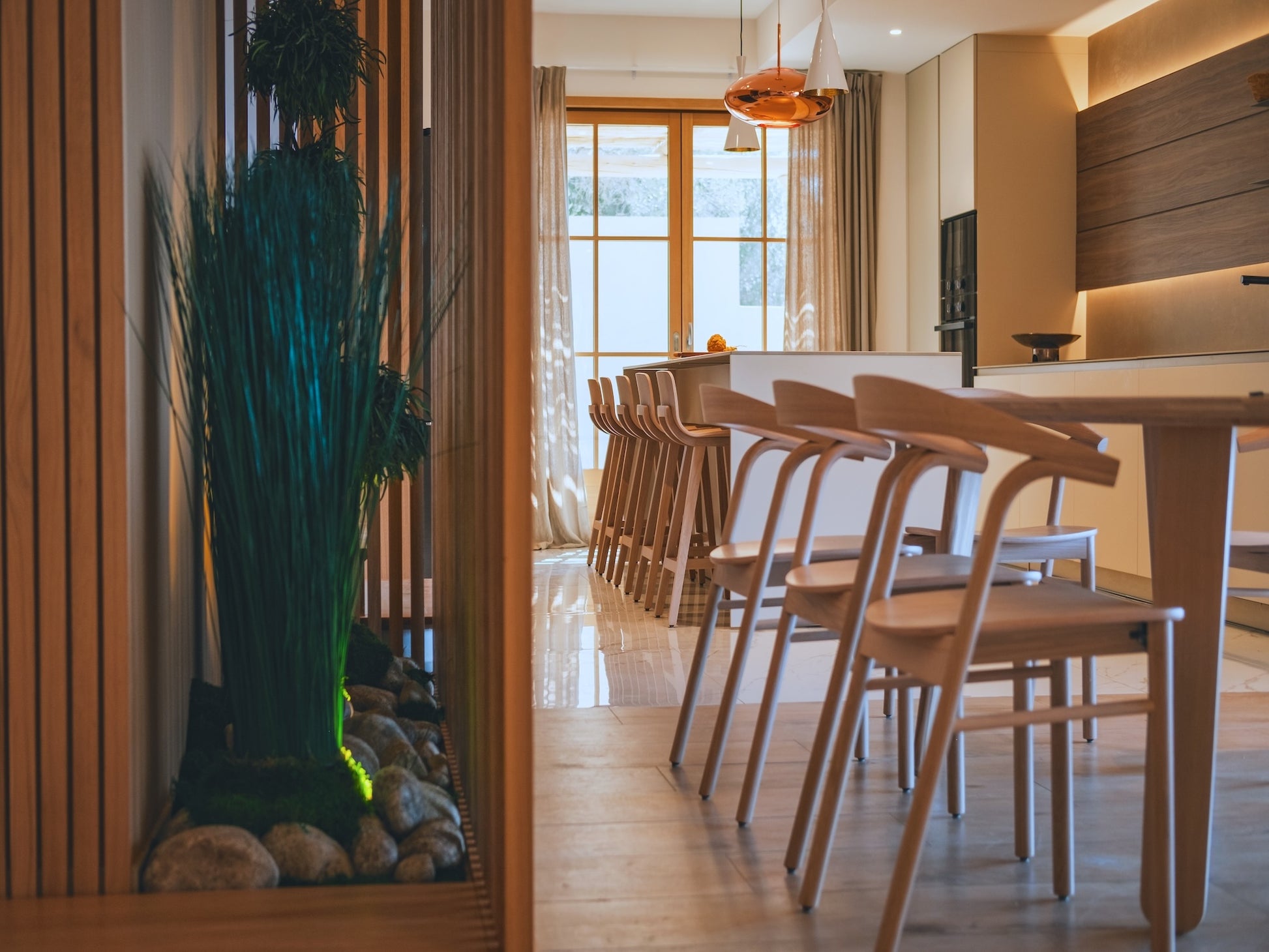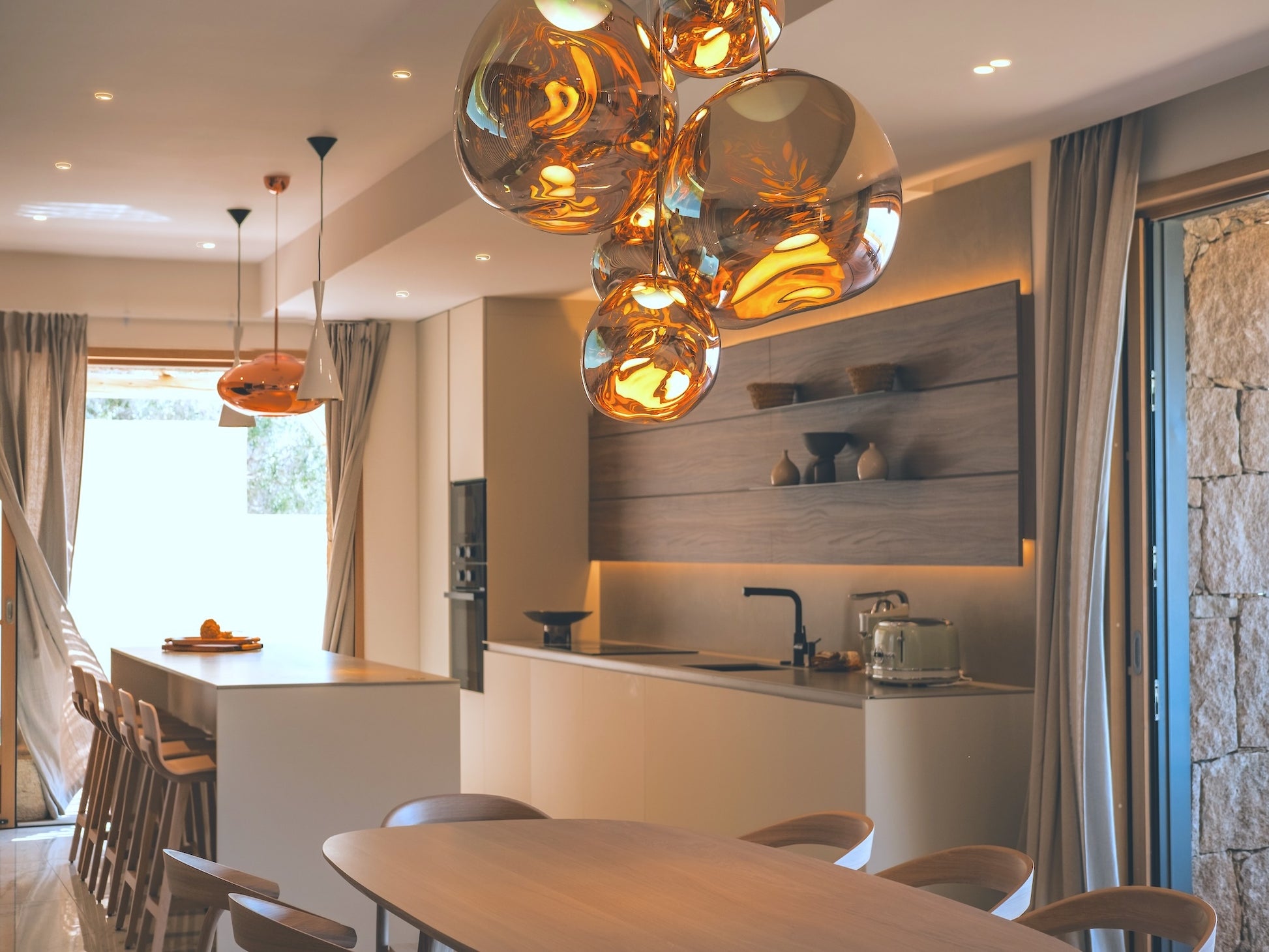 Internet Wifi, linge de maison, draps et serviettes de bain, cuisine entièrement équipée (four, plaques de cuisson, réfrigérateur, lave-vaisselle, vaisselle, ustensiles, bouilloire, machine à café), machine à laver, climatisation, télévision, espace repas intérieur et extérieur, mobilier de jardin, piscine privative à débordement, terrasse aménagée avec transats.
