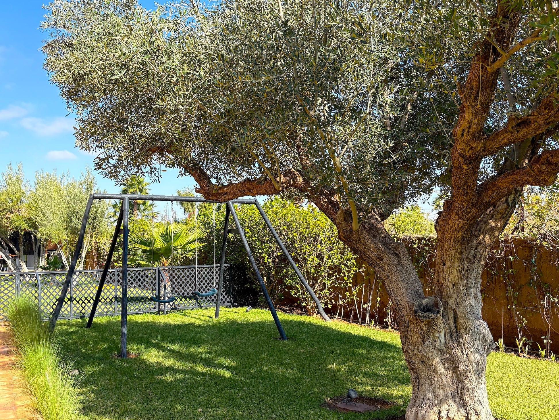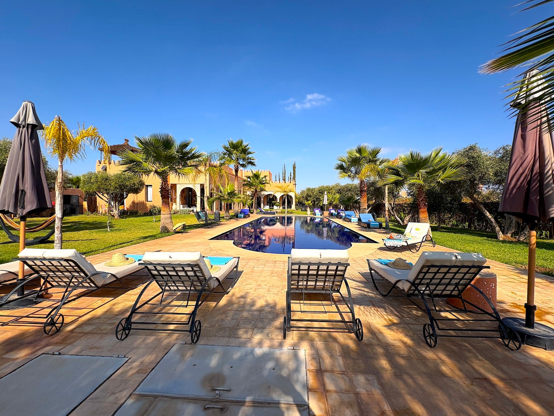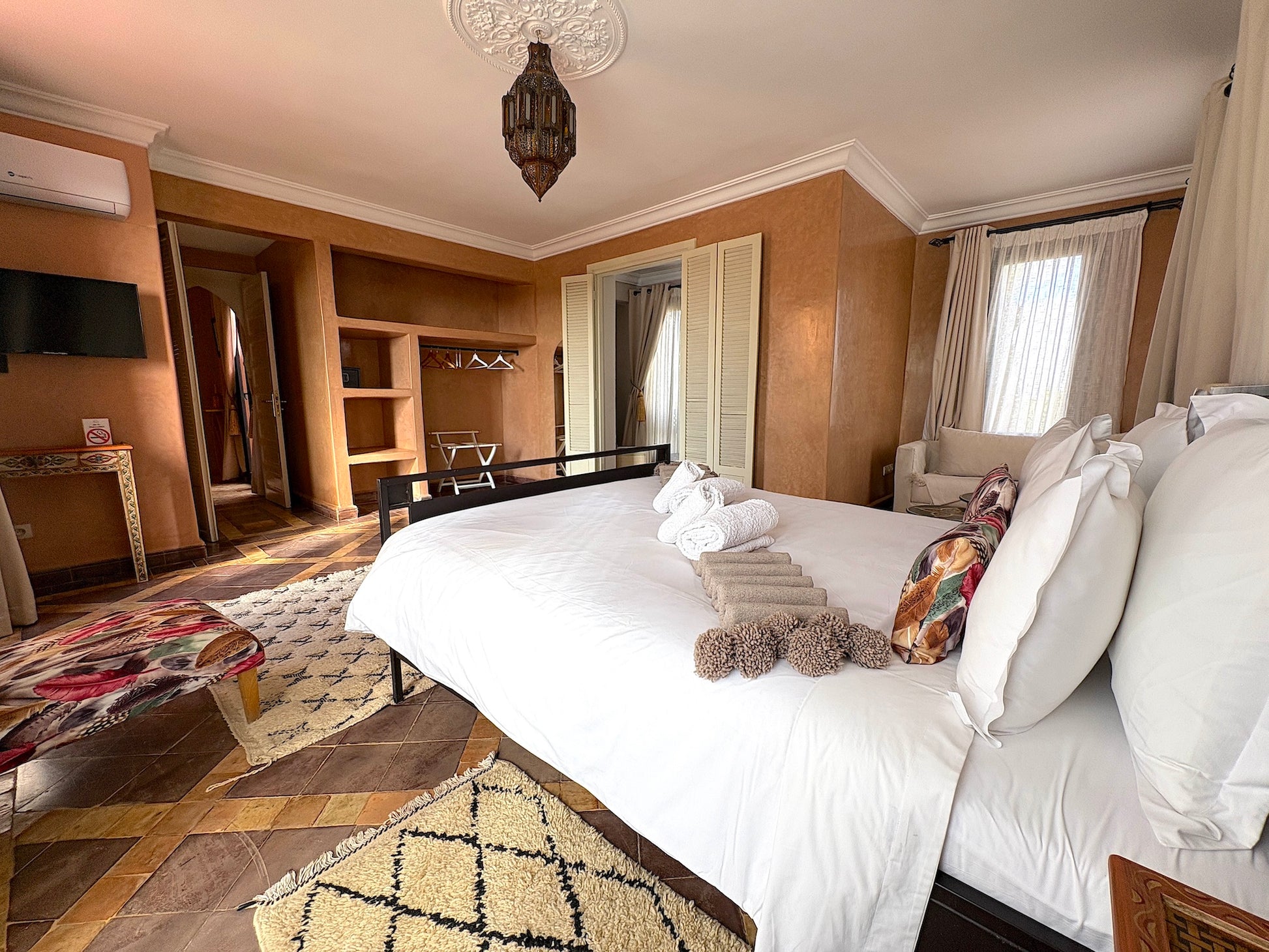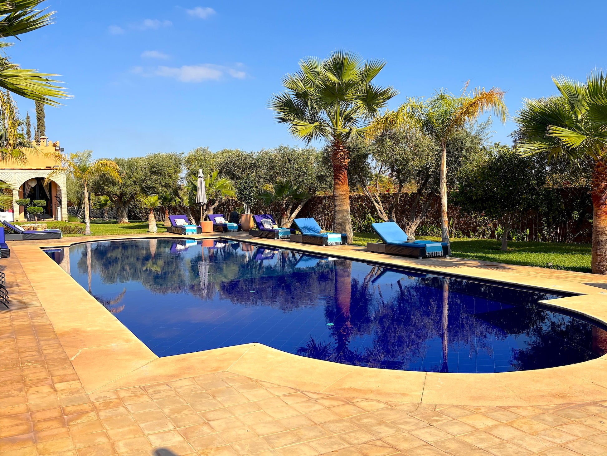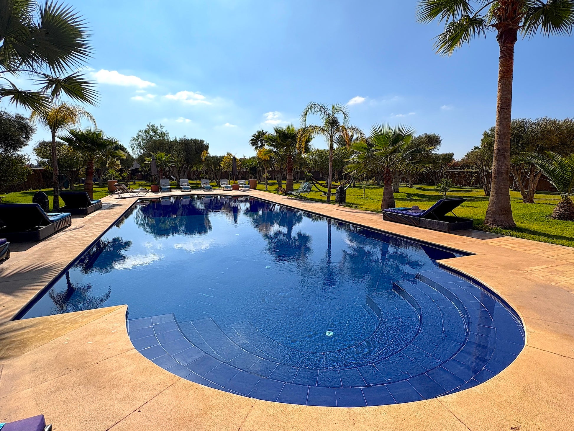 À l’extérieur, profitez d’une piscine privée, entourée de transats, d’un mobilier de jardin raffiné, et d’un espace extérieur spacieux et arboré, idéal pour savourer un moment de calme en toute intimité, sous le soleil de Marrakech. -