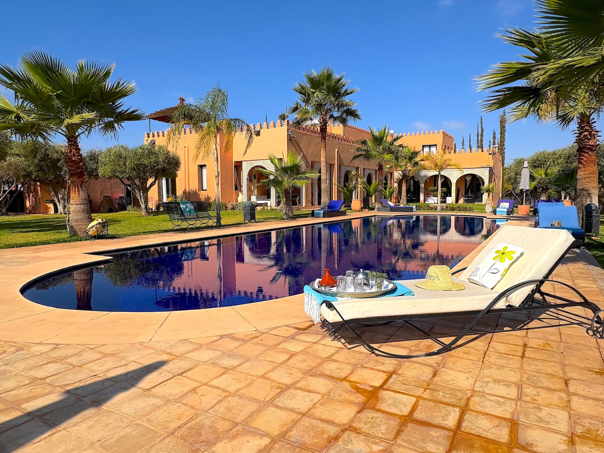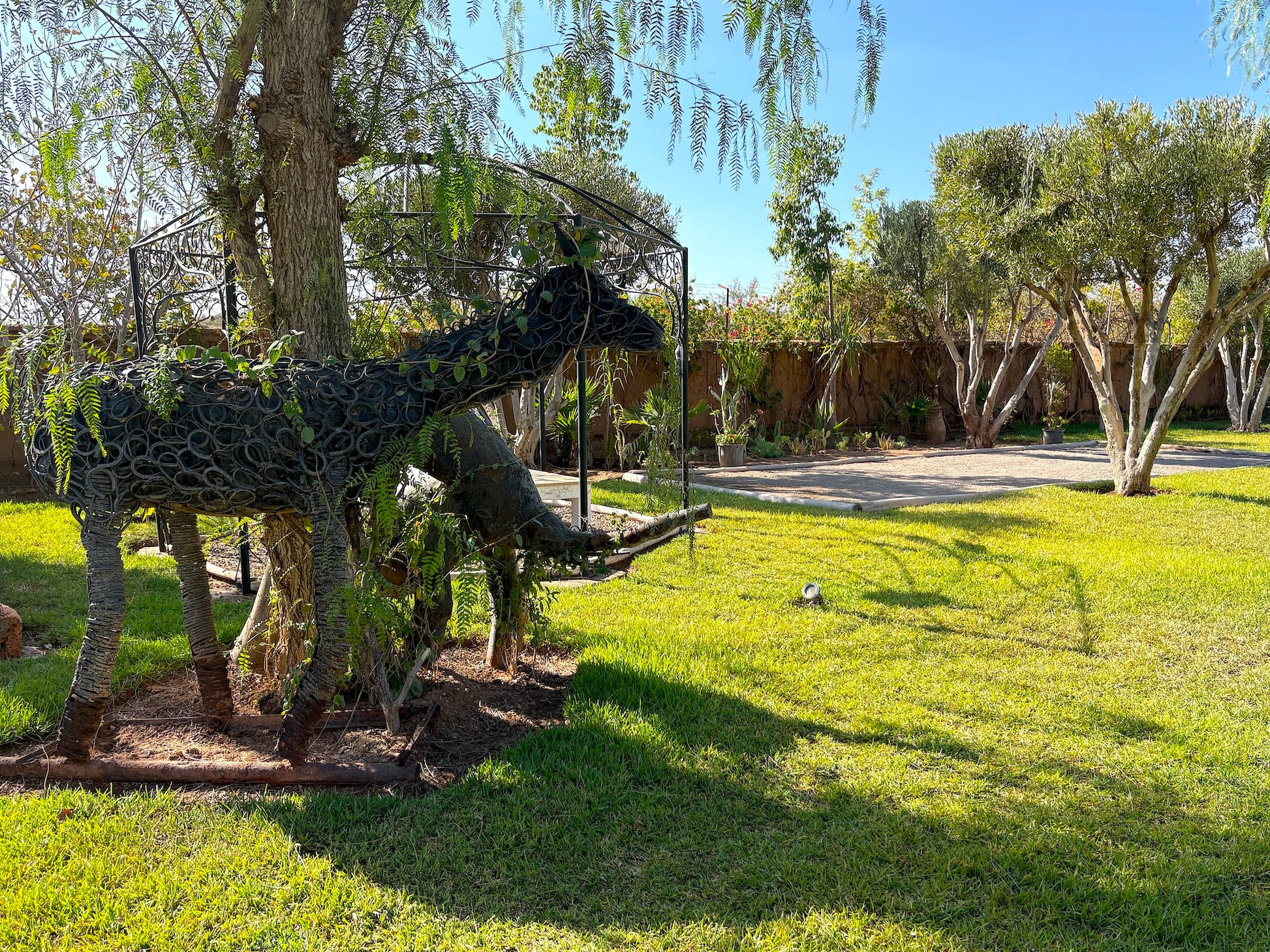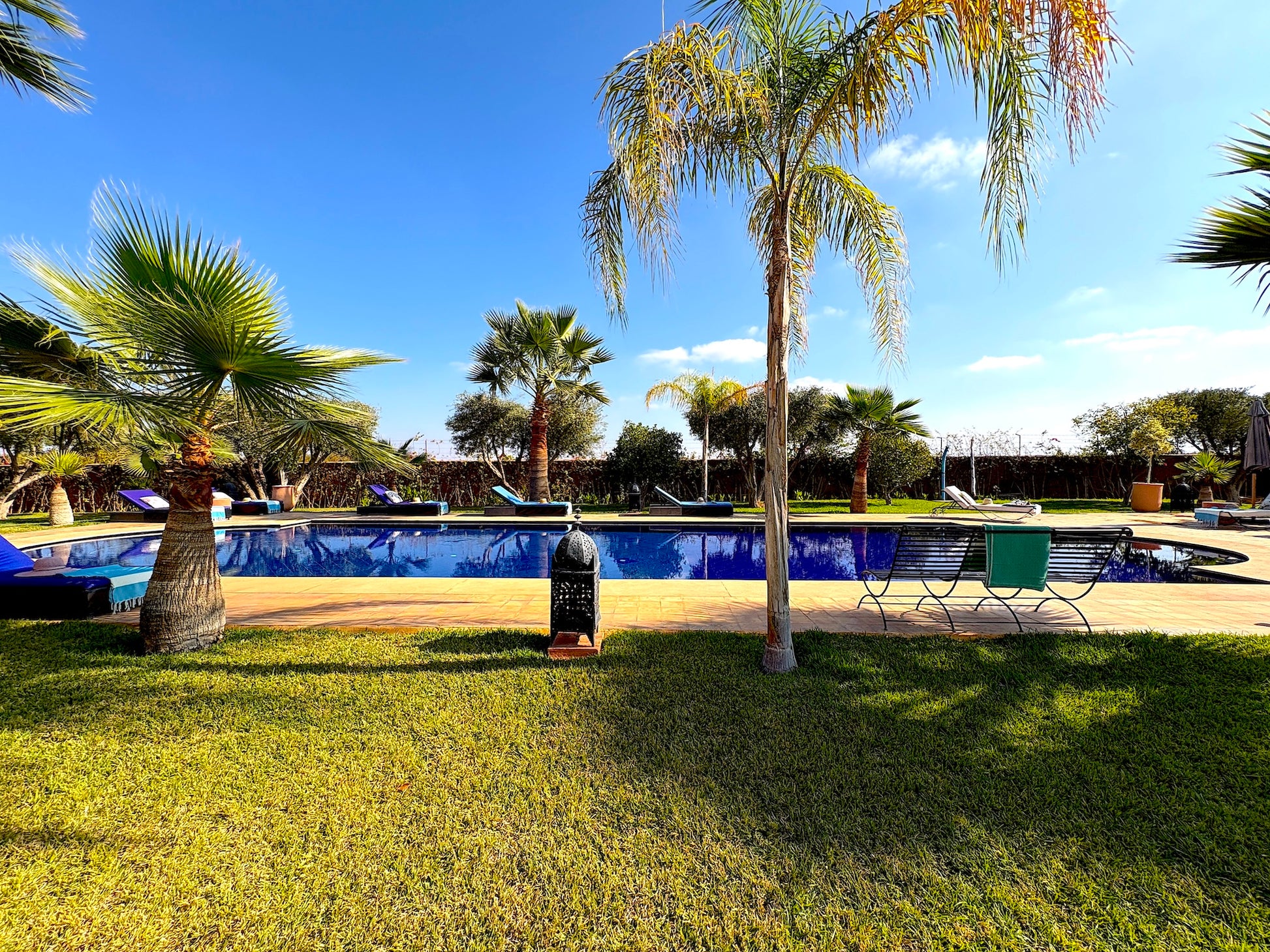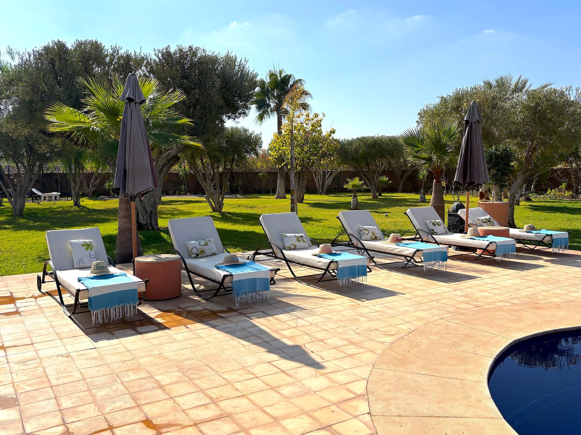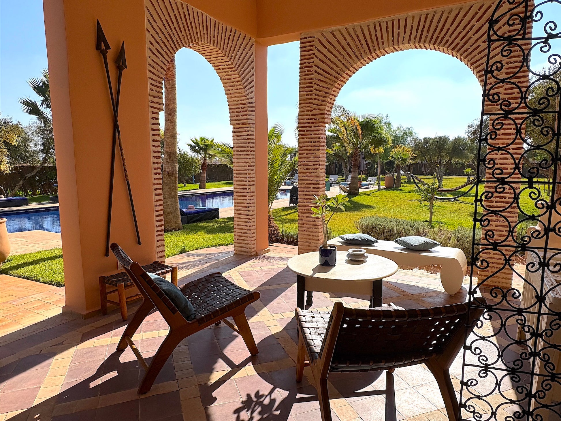 À l’extérieur, profitez d’une piscine privée, entourée de transats, d’un mobilier de jardin raffiné, et d’un espace extérieur spacieux et arboré, idéal pour savourer un moment de calme en toute intimité, sous le soleil de Marrakech. -
