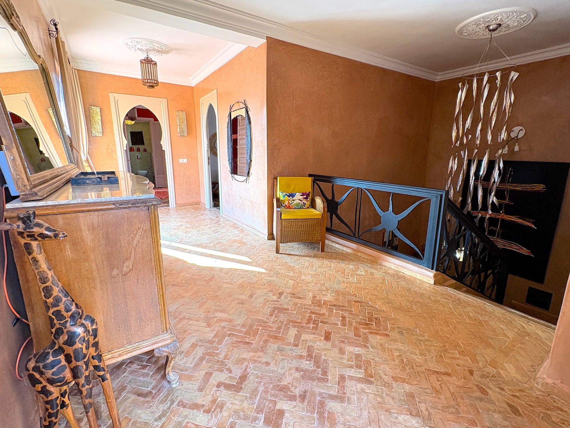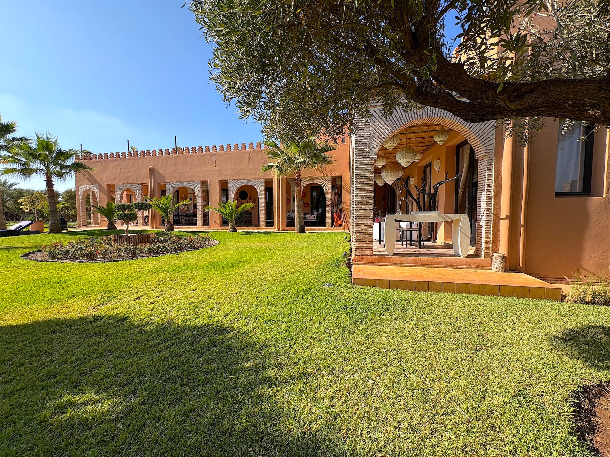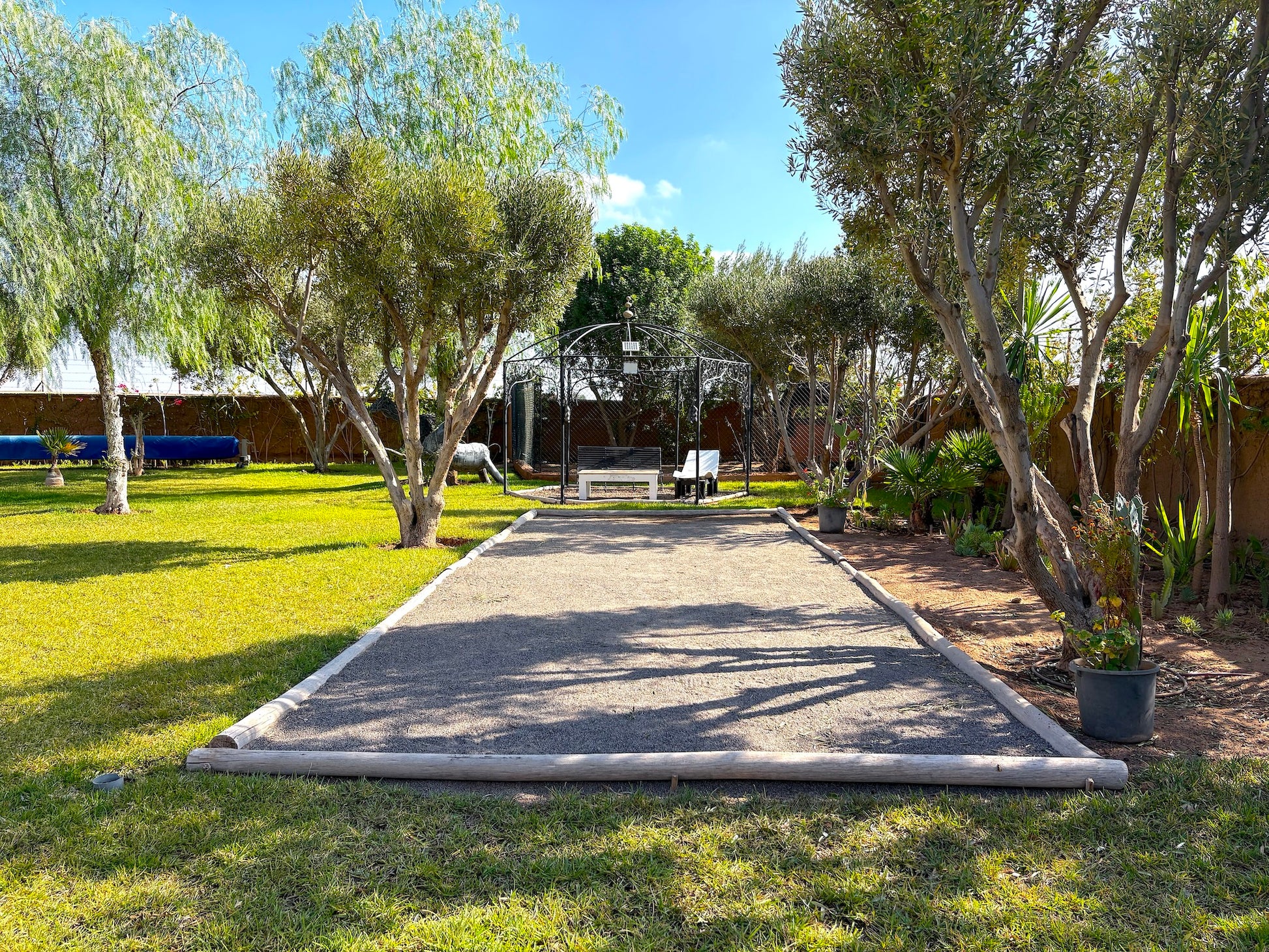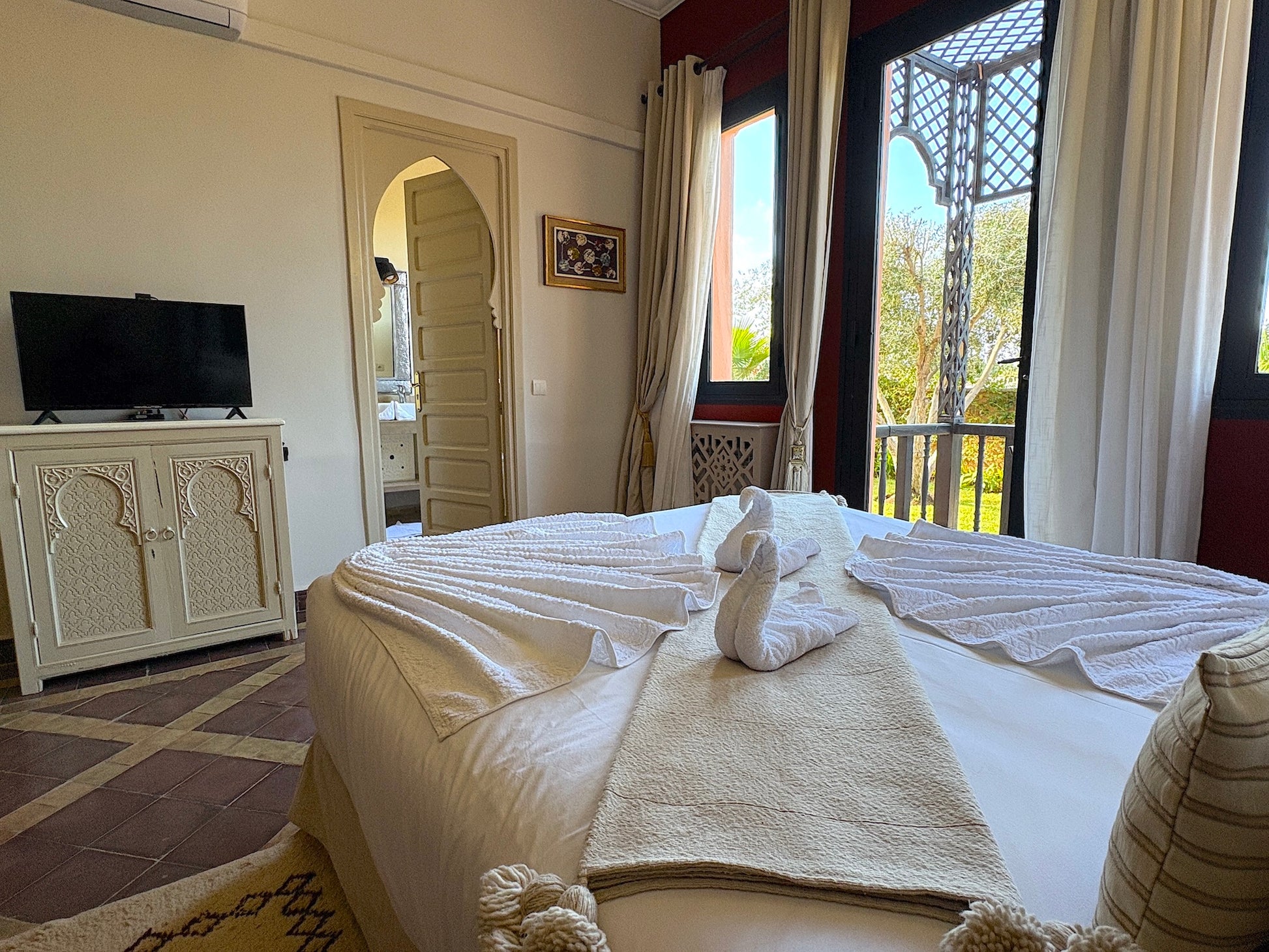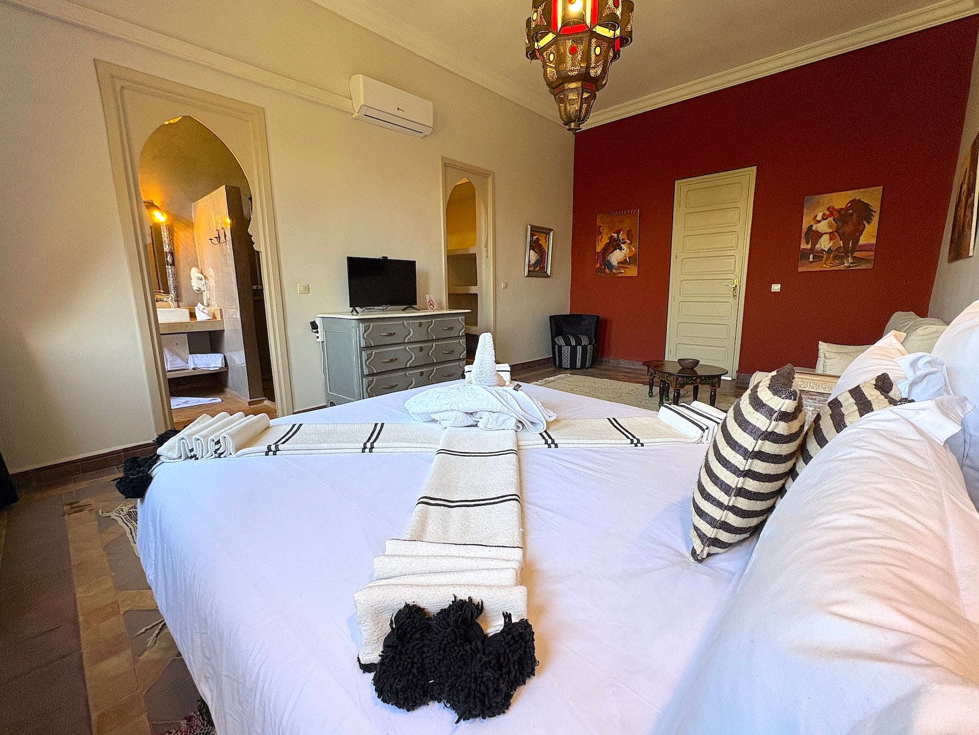 À l’extérieur, profitez d’une piscine privée, entourée de transats, d’un mobilier de jardin raffiné, et d’un espace extérieur spacieux et arboré, idéal pour savourer un moment de calme en toute intimité, sous le soleil de Marrakech. -