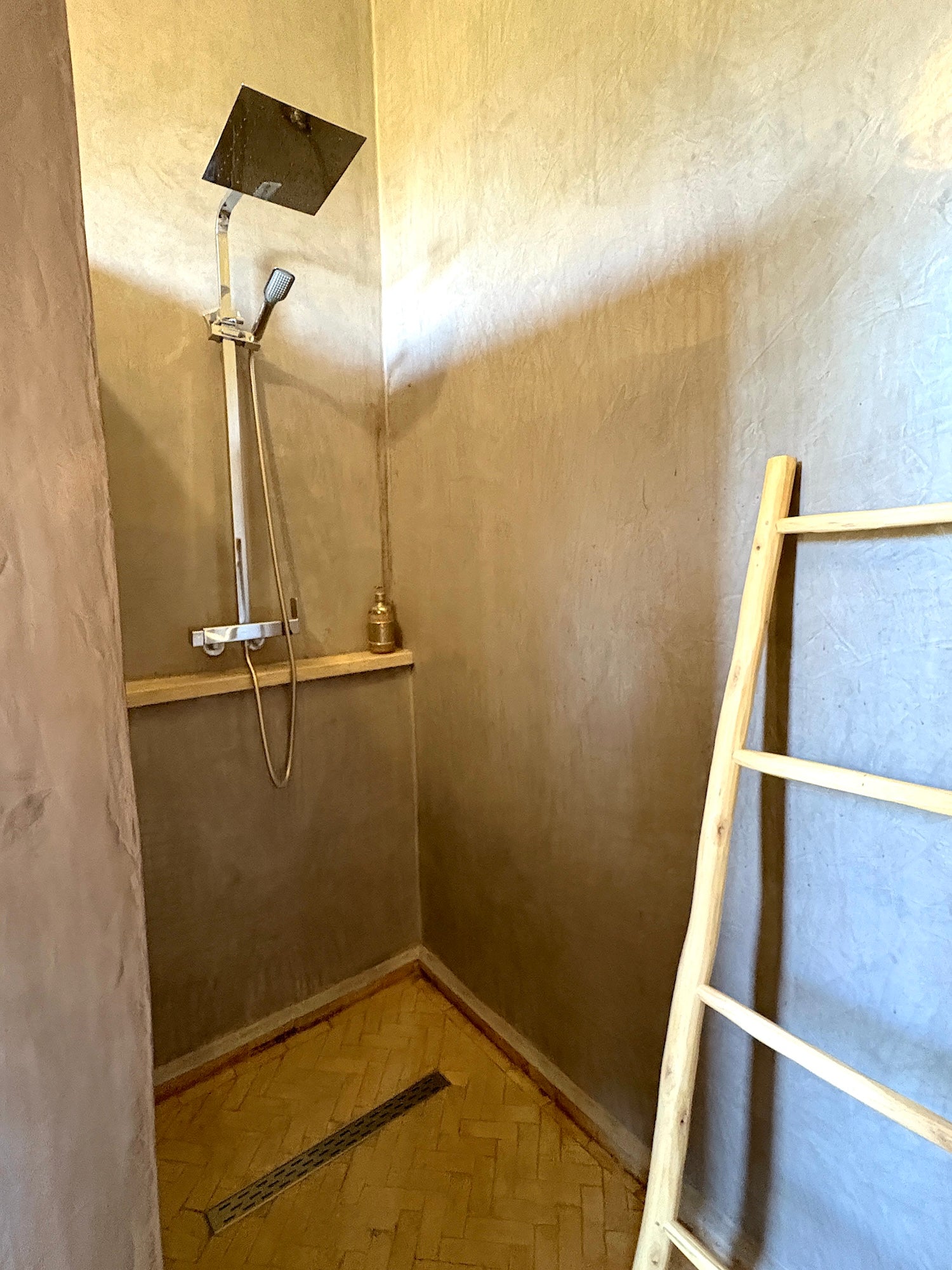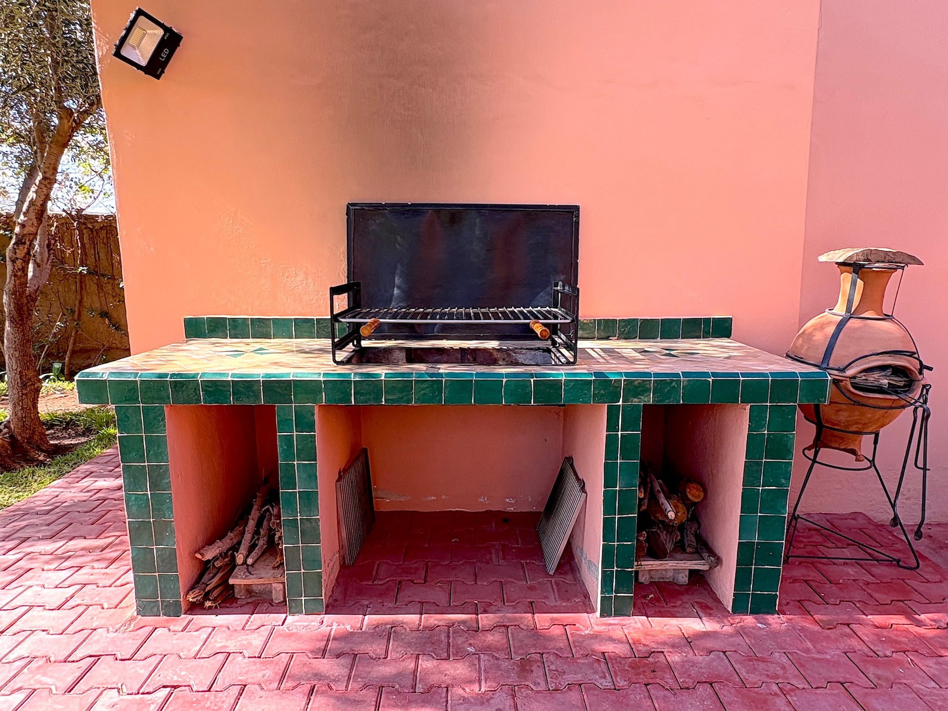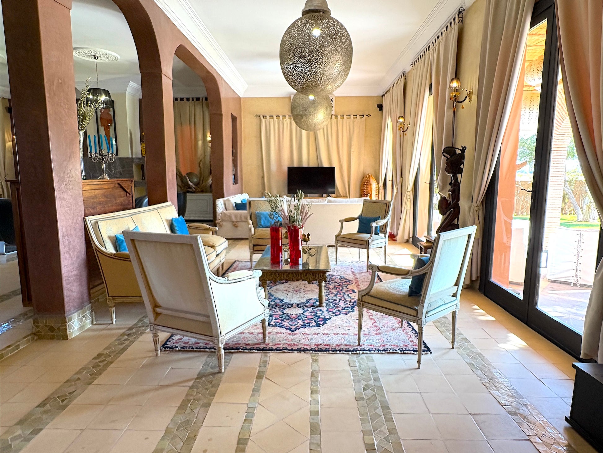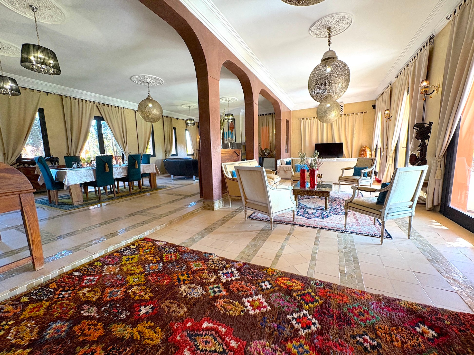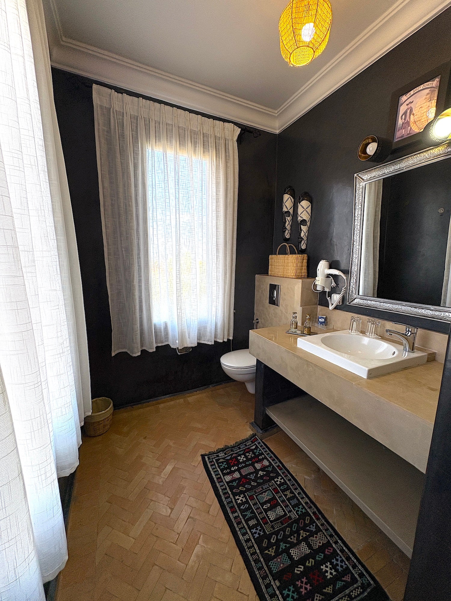 À l’extérieur, profitez d’une piscine privée, entourée de transats, d’un mobilier de jardin raffiné, et d’un espace extérieur spacieux et arboré, idéal pour savourer un moment de calme en toute intimité, sous le soleil de Marrakech. -