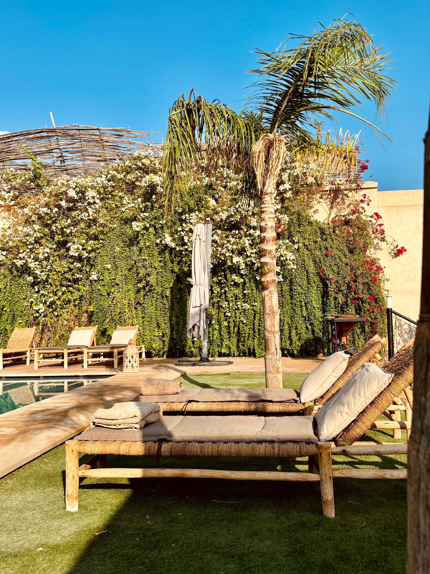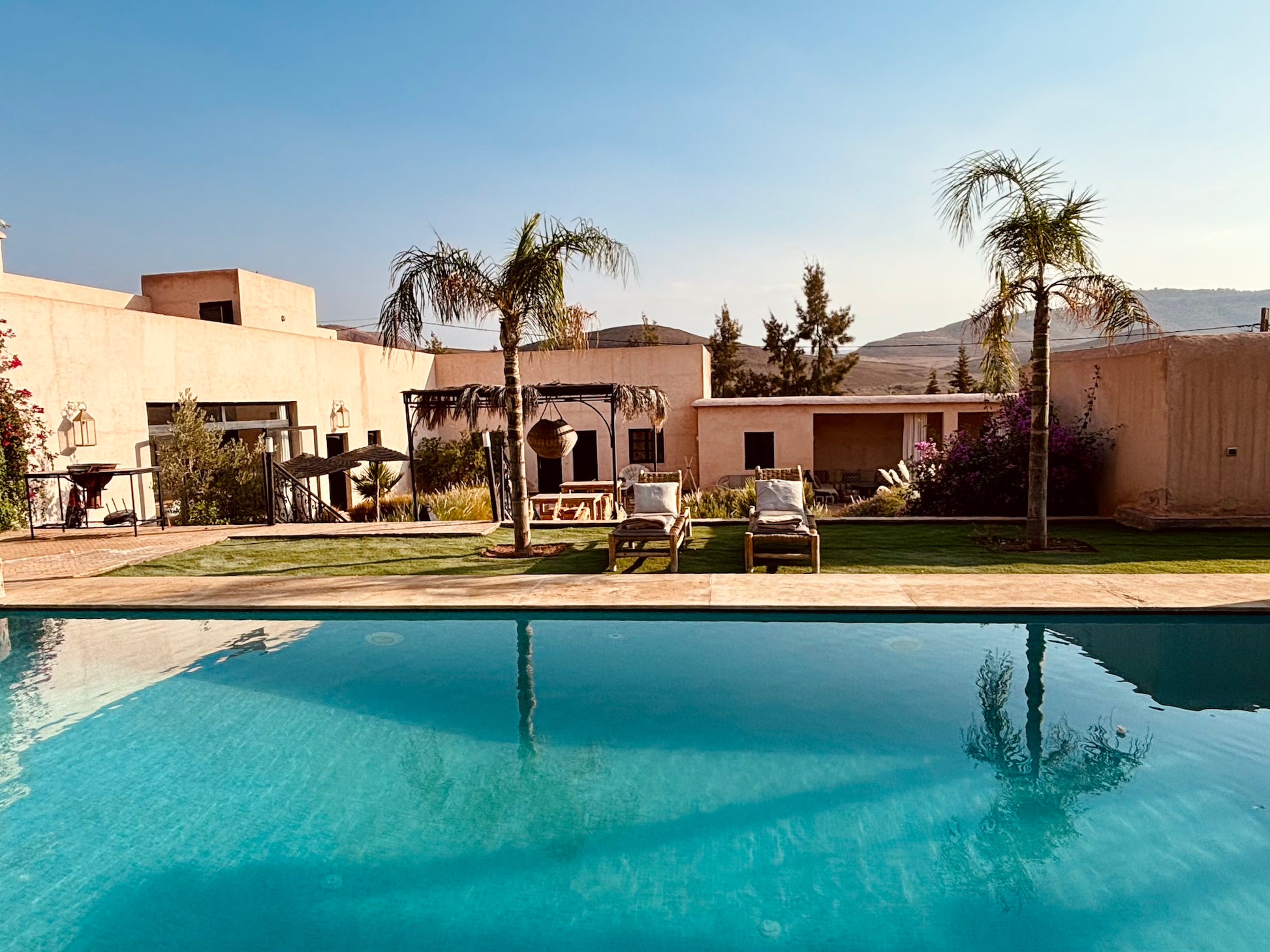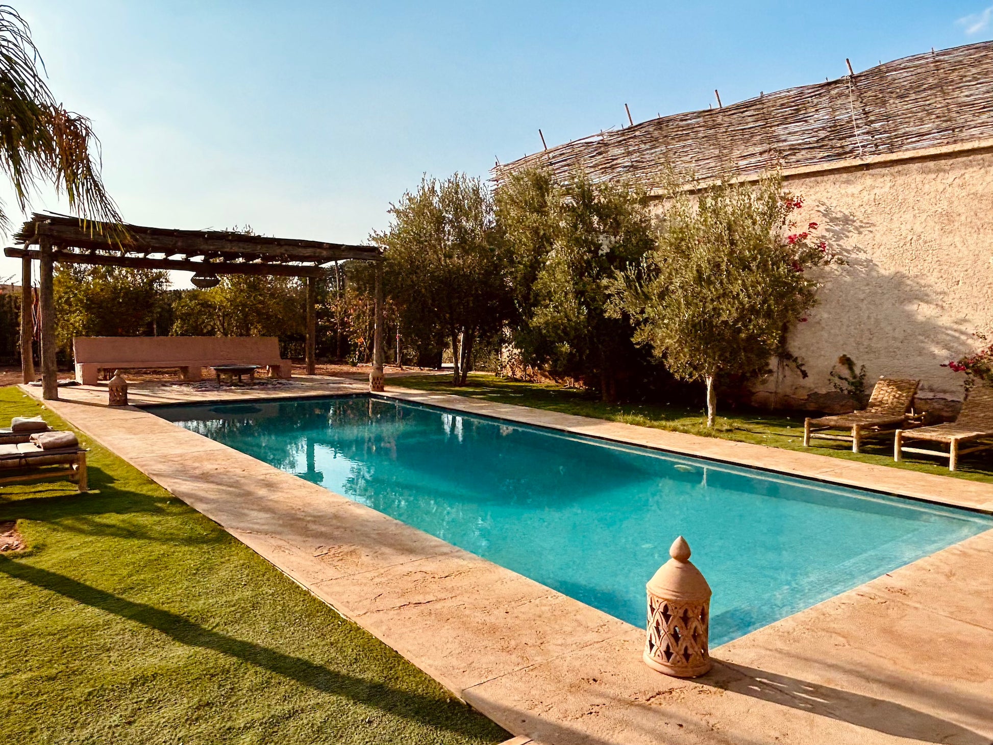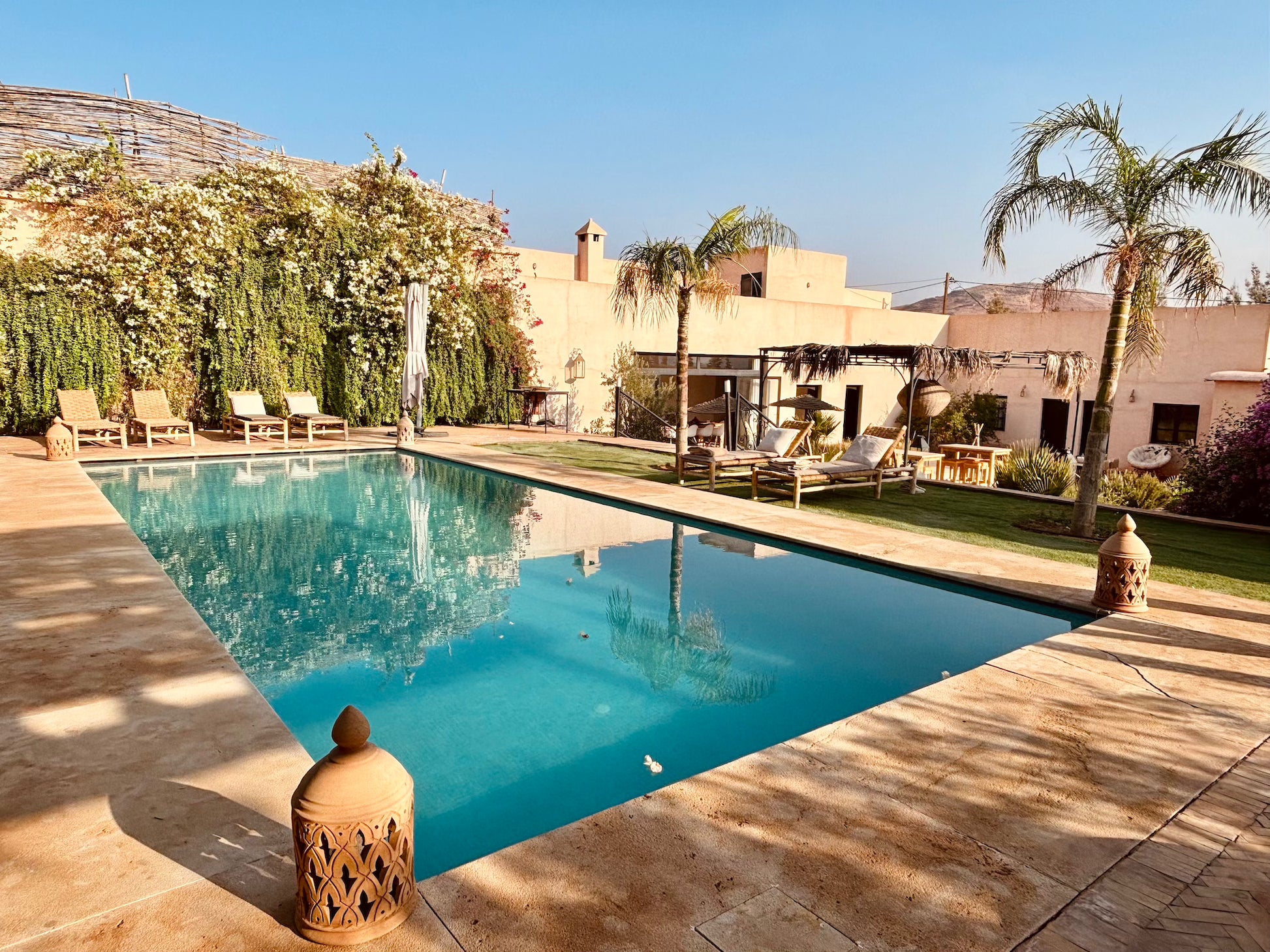 À l’extérieur, une piscine et un salon ombragé vous attendent pour savourer des repas ou simplement profiter des senteurs envoûtantes de l’Orient. Bienvenue dans un domaine préservé où chaque instant devient une expérience inoubliable.