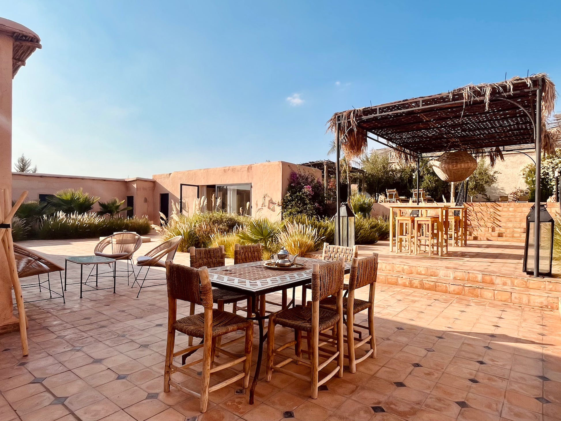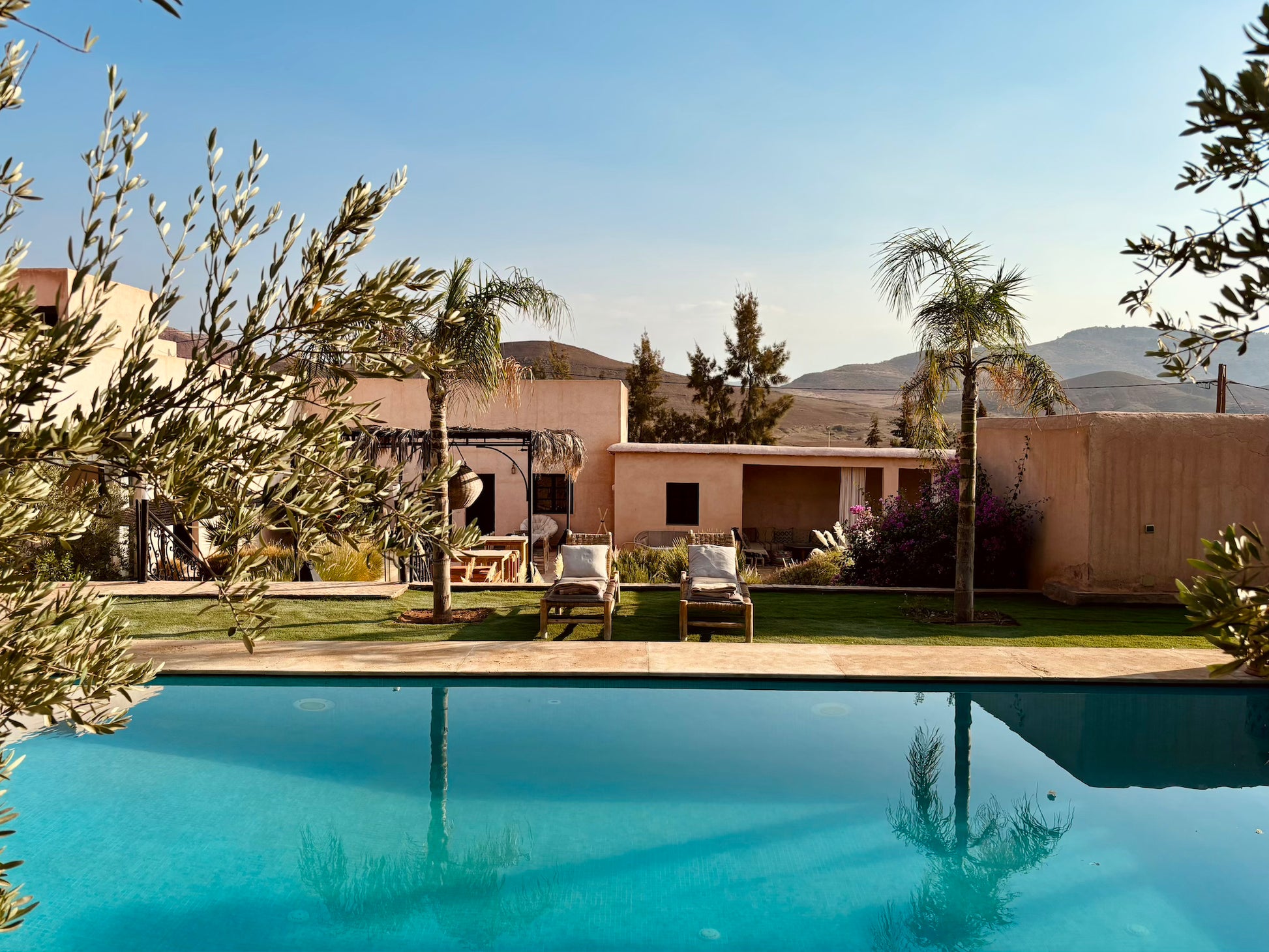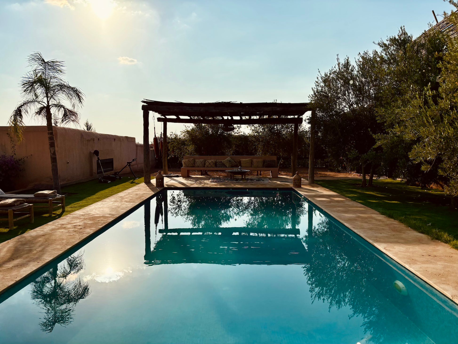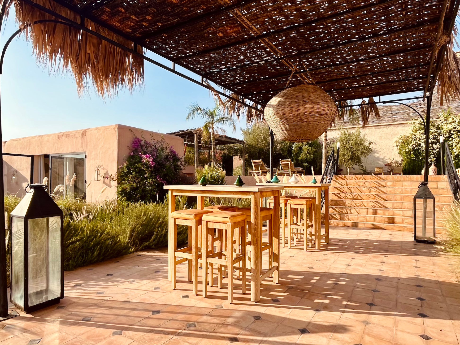 À l’extérieur, une piscine et un salon ombragé vous attendent pour savourer des repas ou simplement profiter des senteurs envoûtantes de l’Orient. Bienvenue dans un domaine préservé où chaque instant devient une expérience inoubliable.