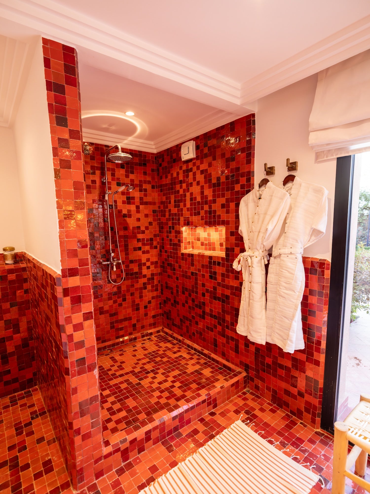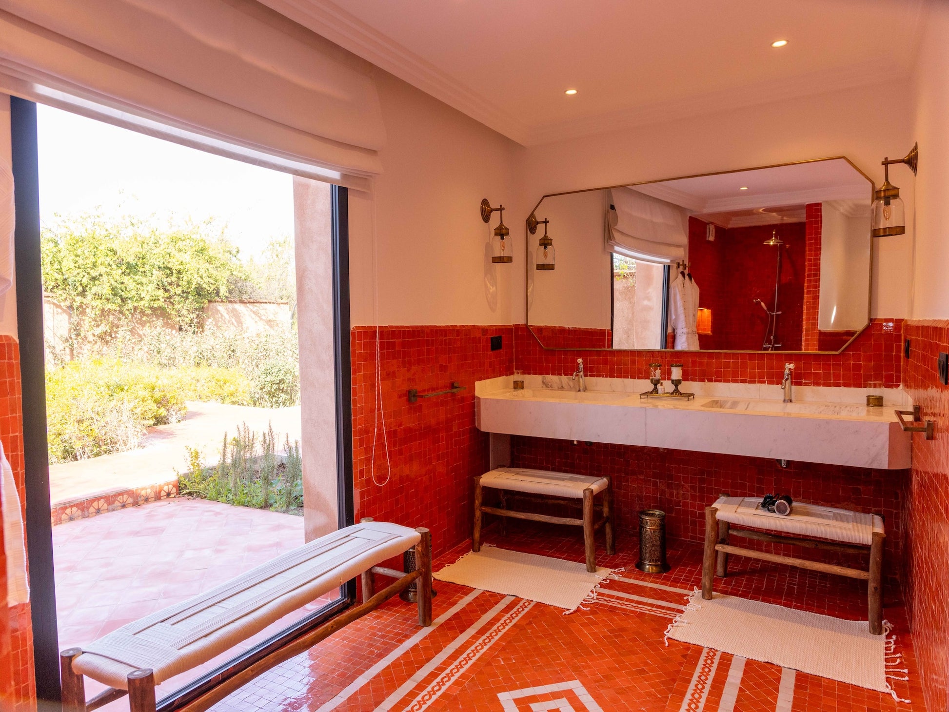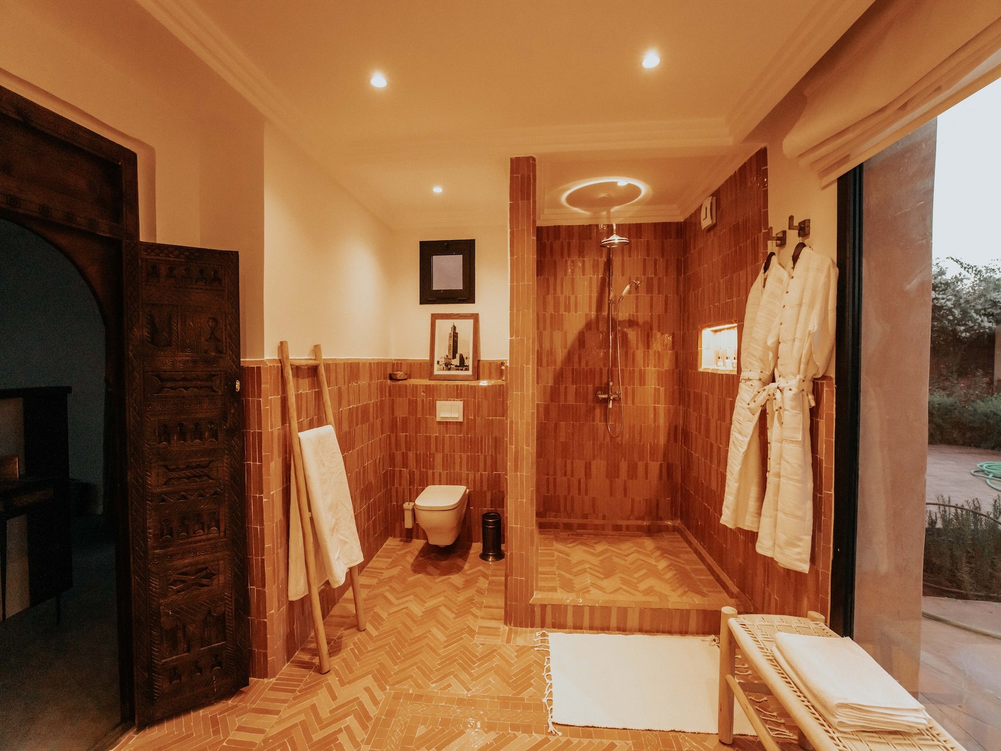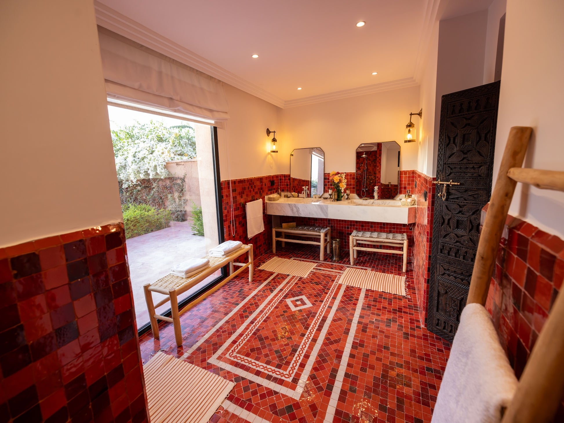 Les voyageurs auront accès à l’ensemble de la propriété et de ses équipements : le riad principal de 300 m², les 4 suites indépendantes avec terrasses privées, les espaces de vie intérieurs et extérieurs ainsi que le parc privé d’un hectare composé de jardins paysagers, d’une oliveraie et d’une roseraie. La piscine au sel chauffée de 21 mètres, le sauna, la salle de sport entièrement équipée avec machine de Pilates, le terrain de padel, le mini terrain de football, le terrain de pétanque, la table de ping-pong et l’espace brasero sont également à votre disposition pour profiter pleinement du domaine et de son cadre exceptionnel face aux montagnes de l’Atlas.