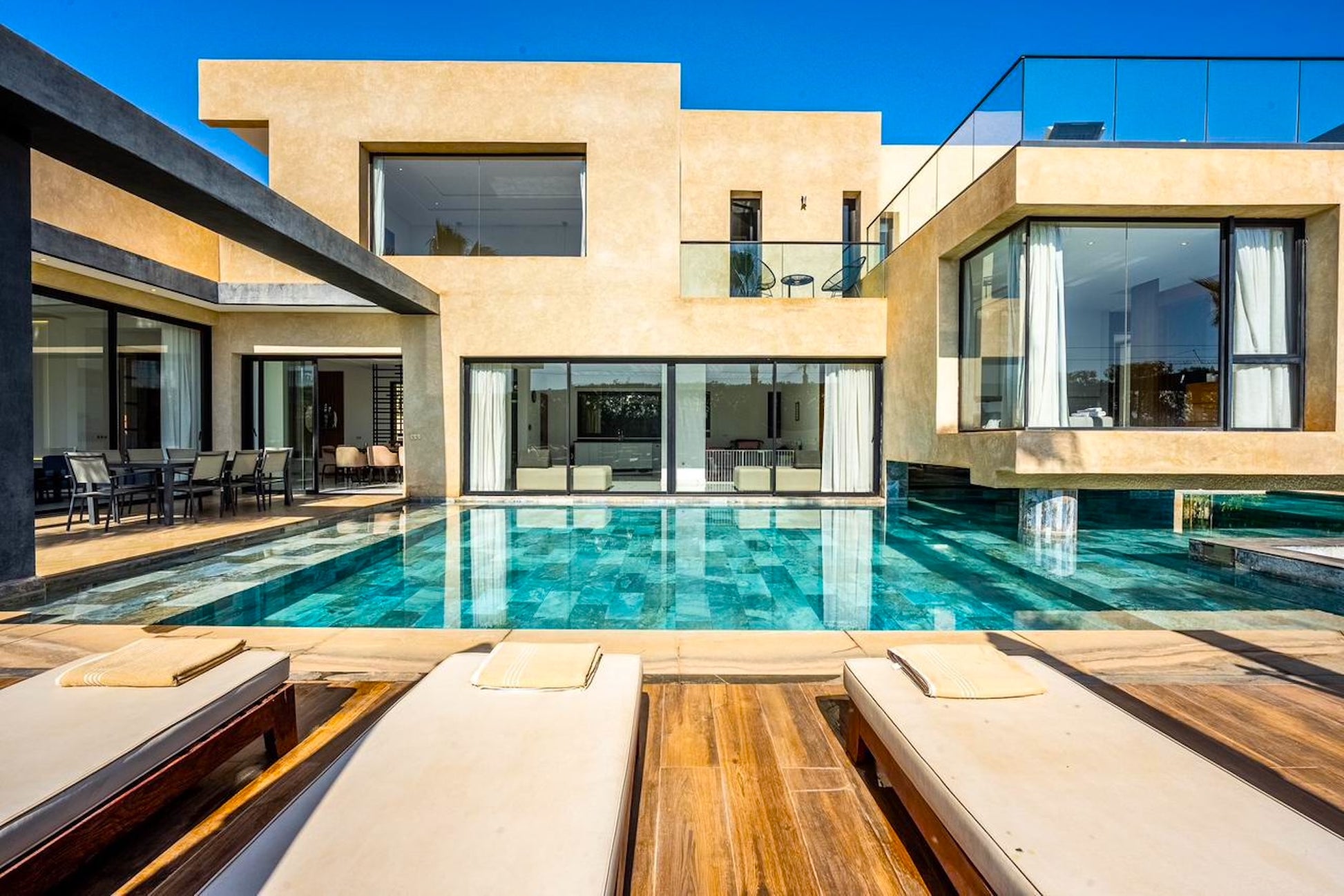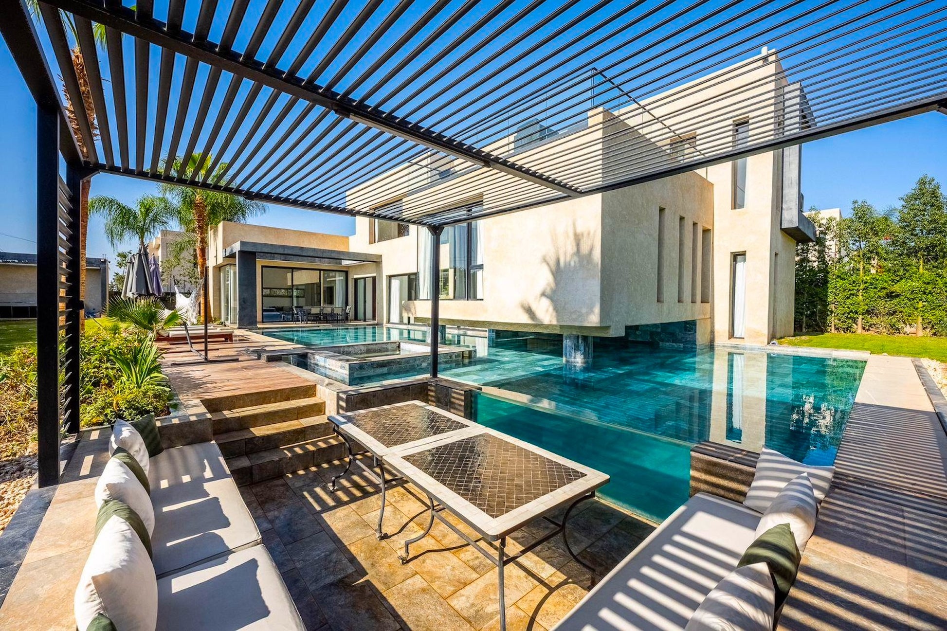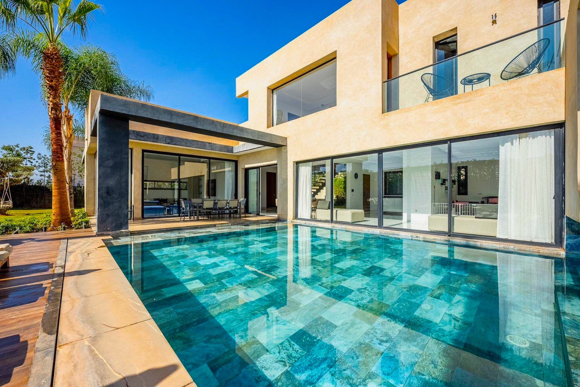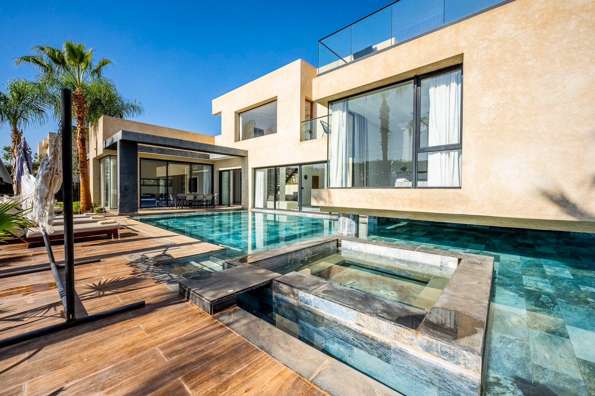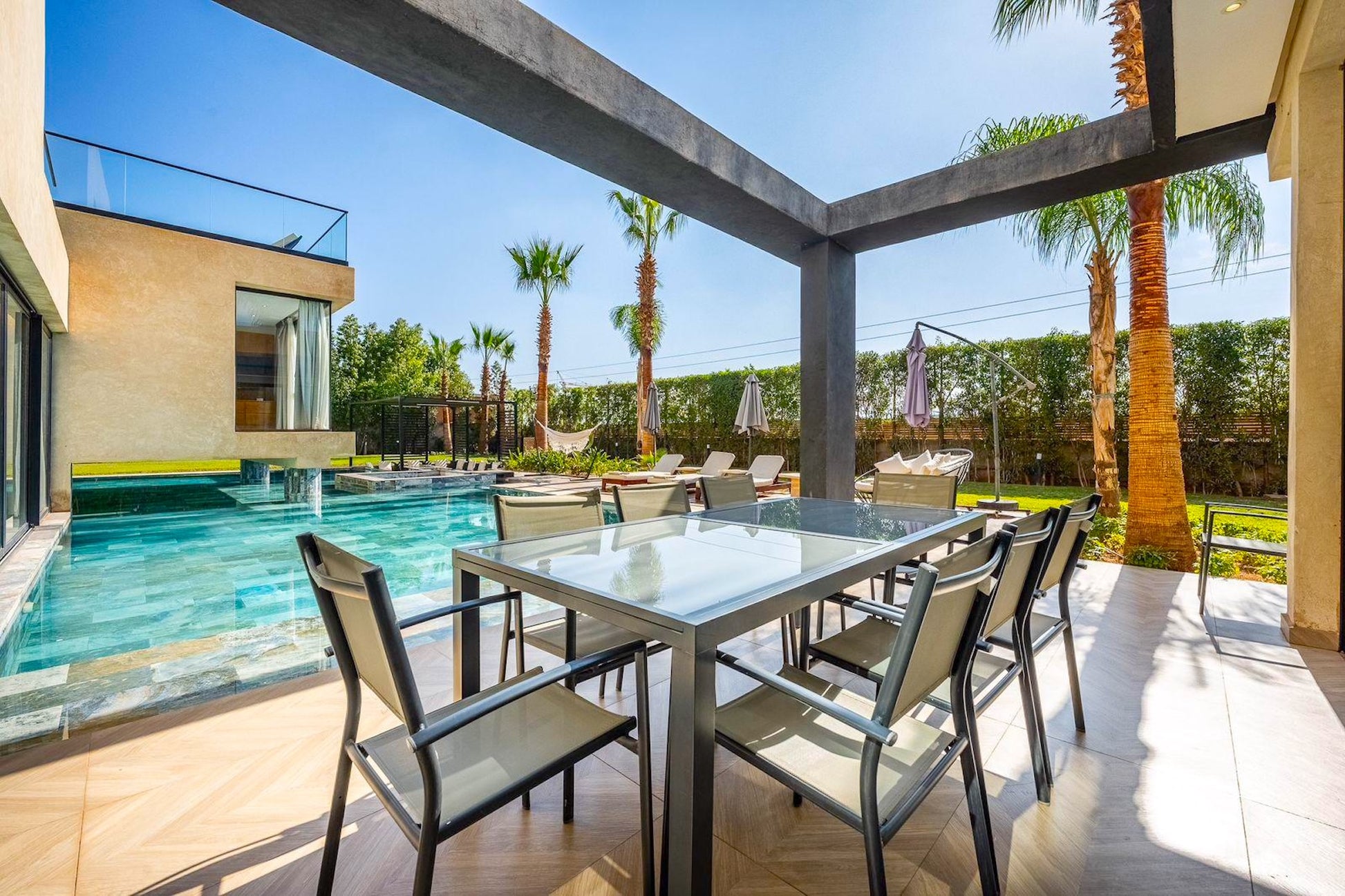 Le Palais Mahora incarne une vision contemporaine du séjour haut de gamme. Édifiée sur un vaste terrain arboré, cette villa moderne séduit par ses volumes généreux, sa luminosité naturelle et son atmosphère paisible. Pensée pour accueillir familles et groupes dans un cadre sécurisé et élégant, elle offre un équilibre parfait entre confort, intimité et douceur de vivre marocaine.