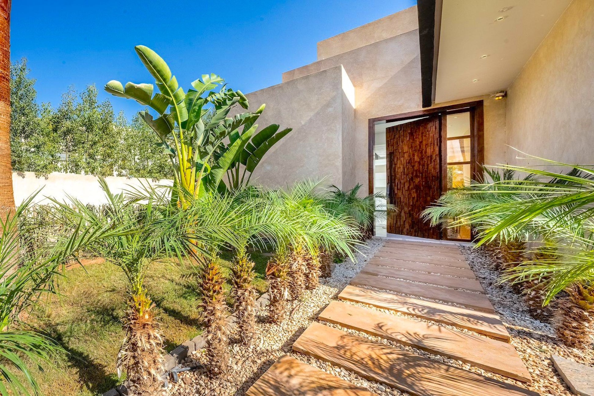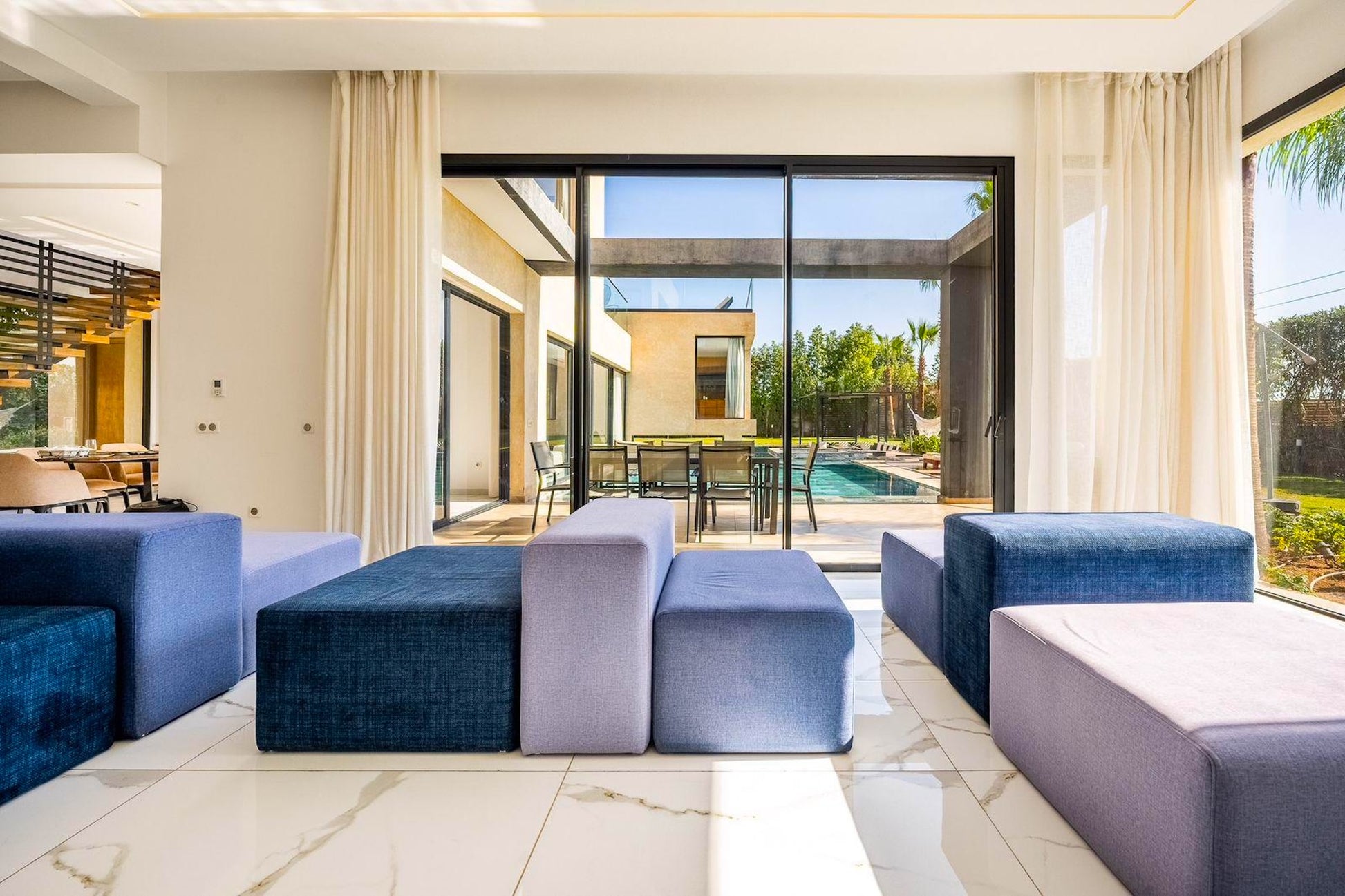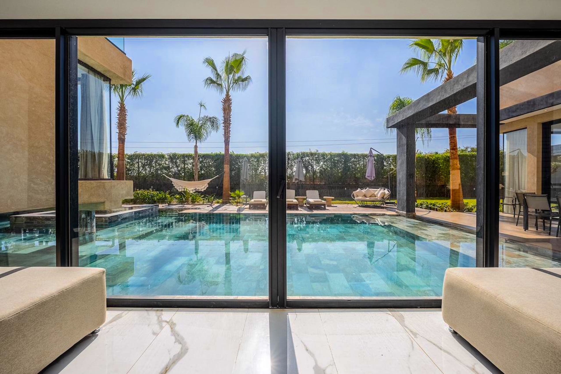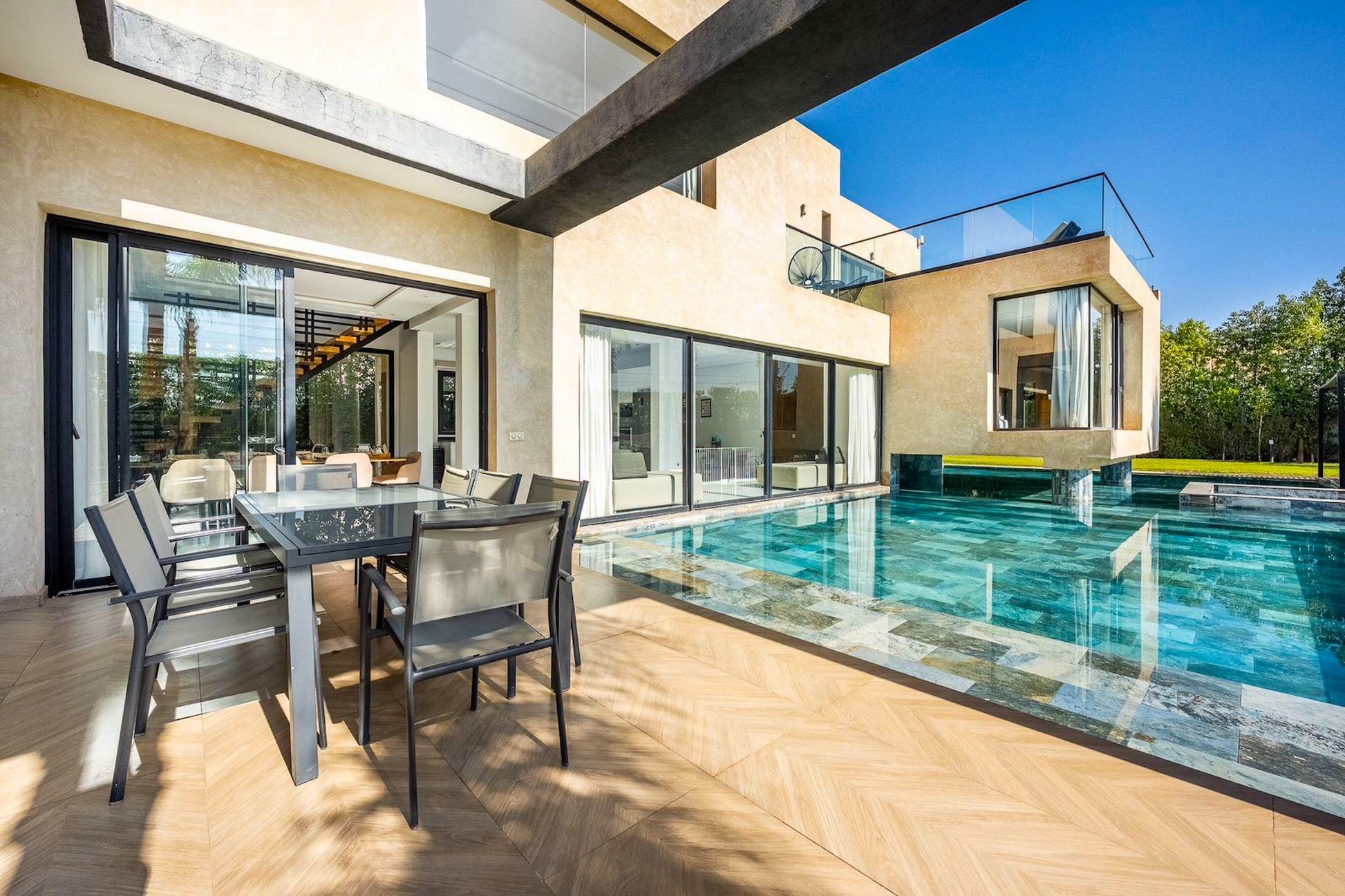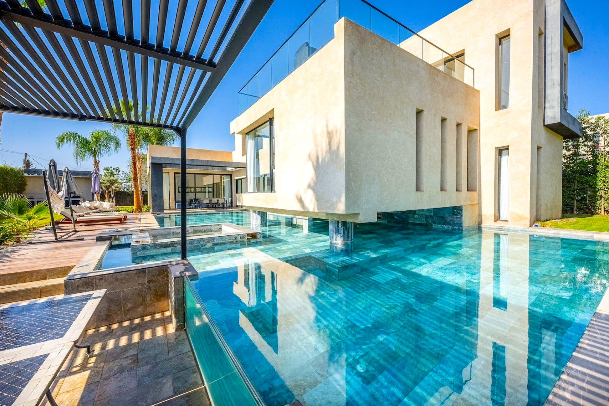 Le Palais Mahora incarne une vision contemporaine du séjour haut de gamme. Édifiée sur un vaste terrain arboré, cette villa moderne séduit par ses volumes généreux, sa luminosité naturelle et son atmosphère paisible. Pensée pour accueillir familles et groupes dans un cadre sécurisé et élégant, elle offre un équilibre parfait entre confort, intimité et douceur de vivre marocaine.