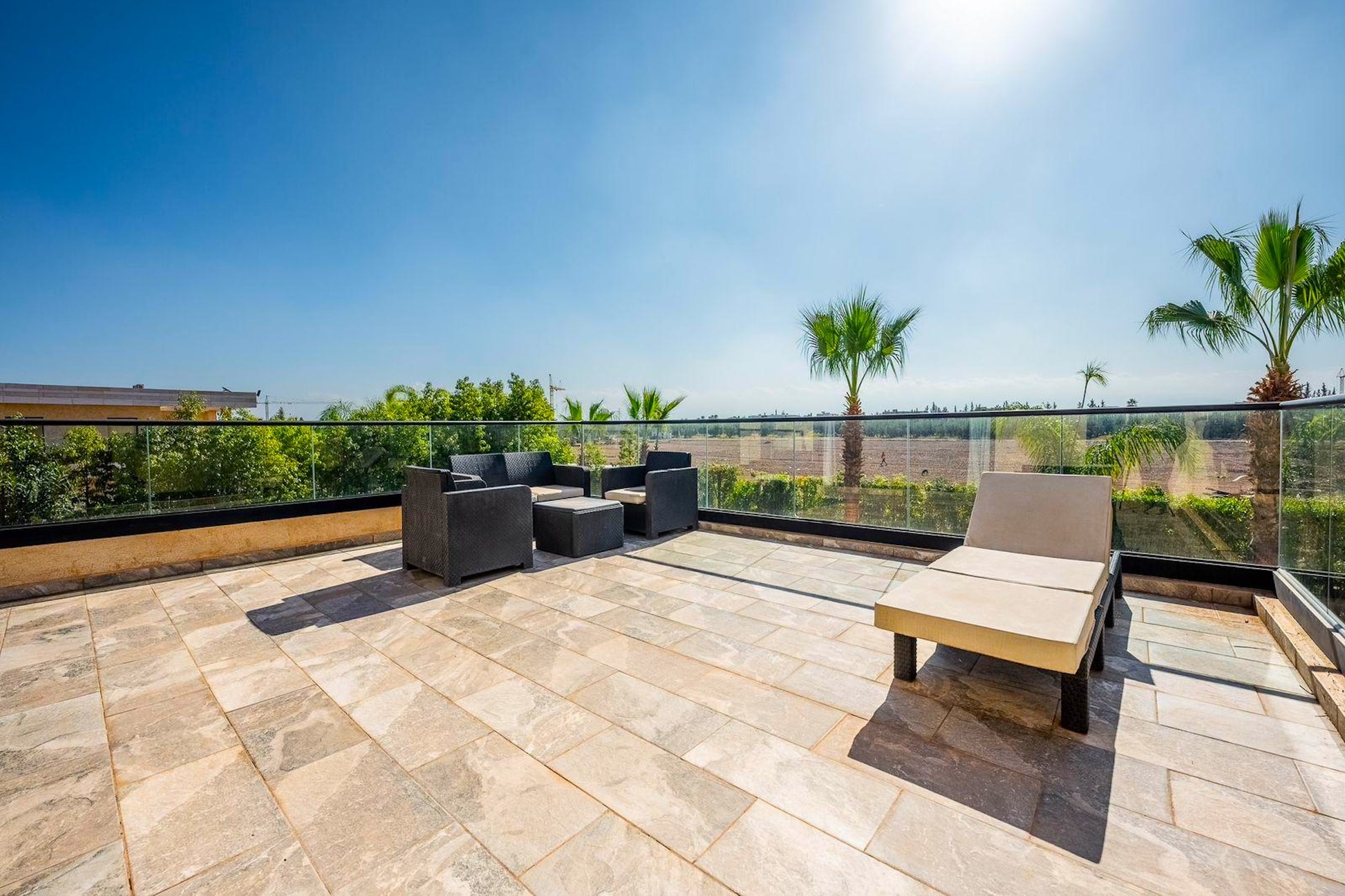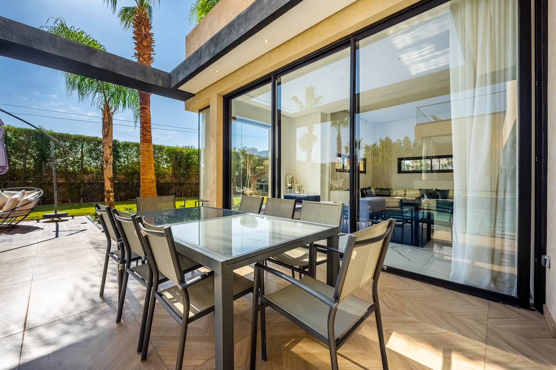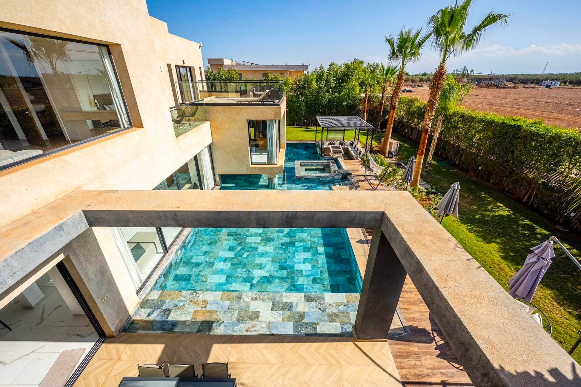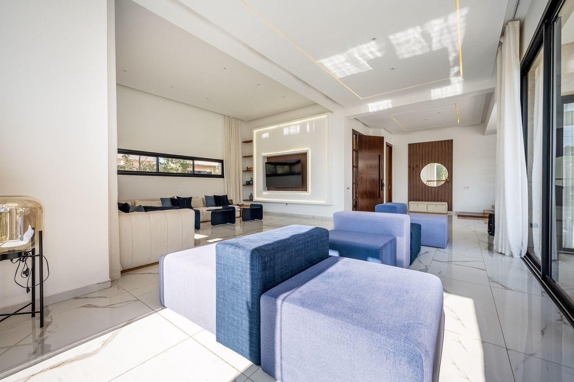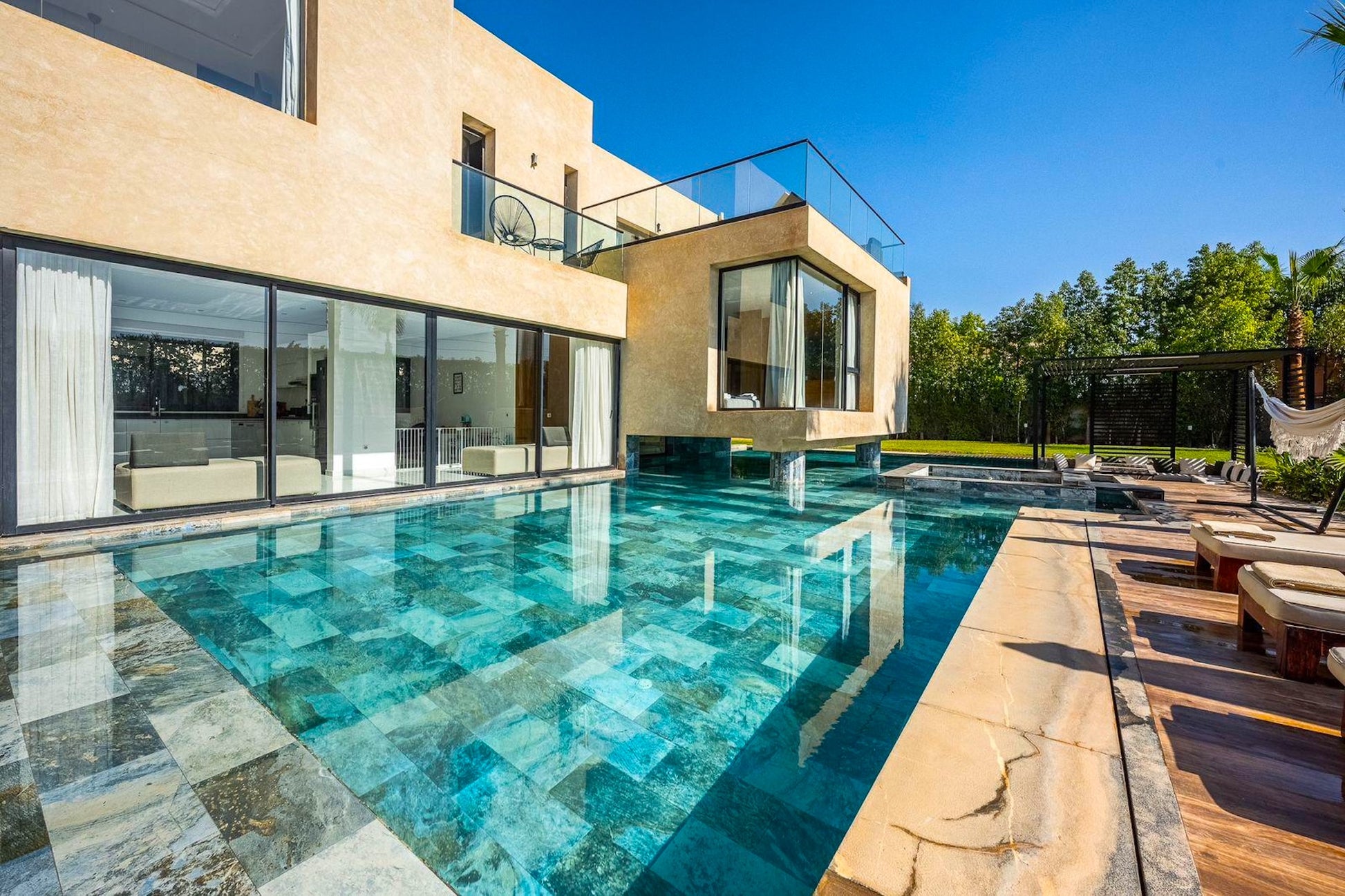 Le Palais Mahora incarne une vision contemporaine du séjour haut de gamme. Édifiée sur un vaste terrain arboré, cette villa moderne séduit par ses volumes généreux, sa luminosité naturelle et son atmosphère paisible. Pensée pour accueillir familles et groupes dans un cadre sécurisé et élégant, elle offre un équilibre parfait entre confort, intimité et douceur de vivre marocaine.