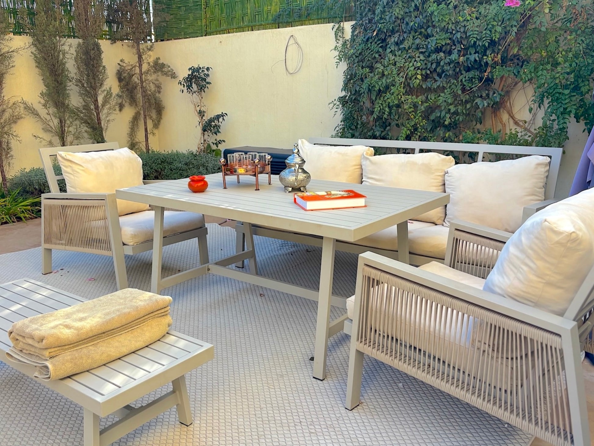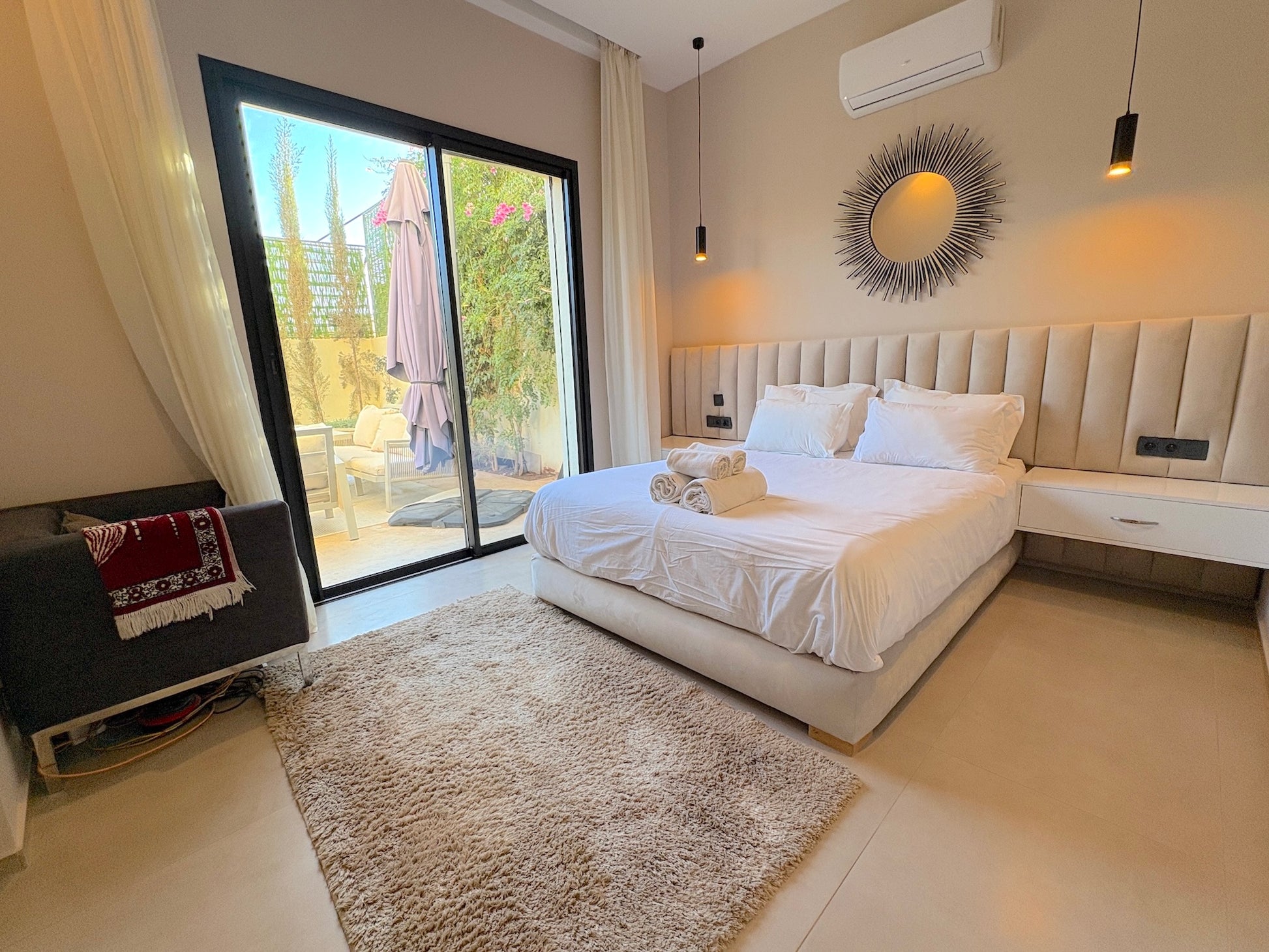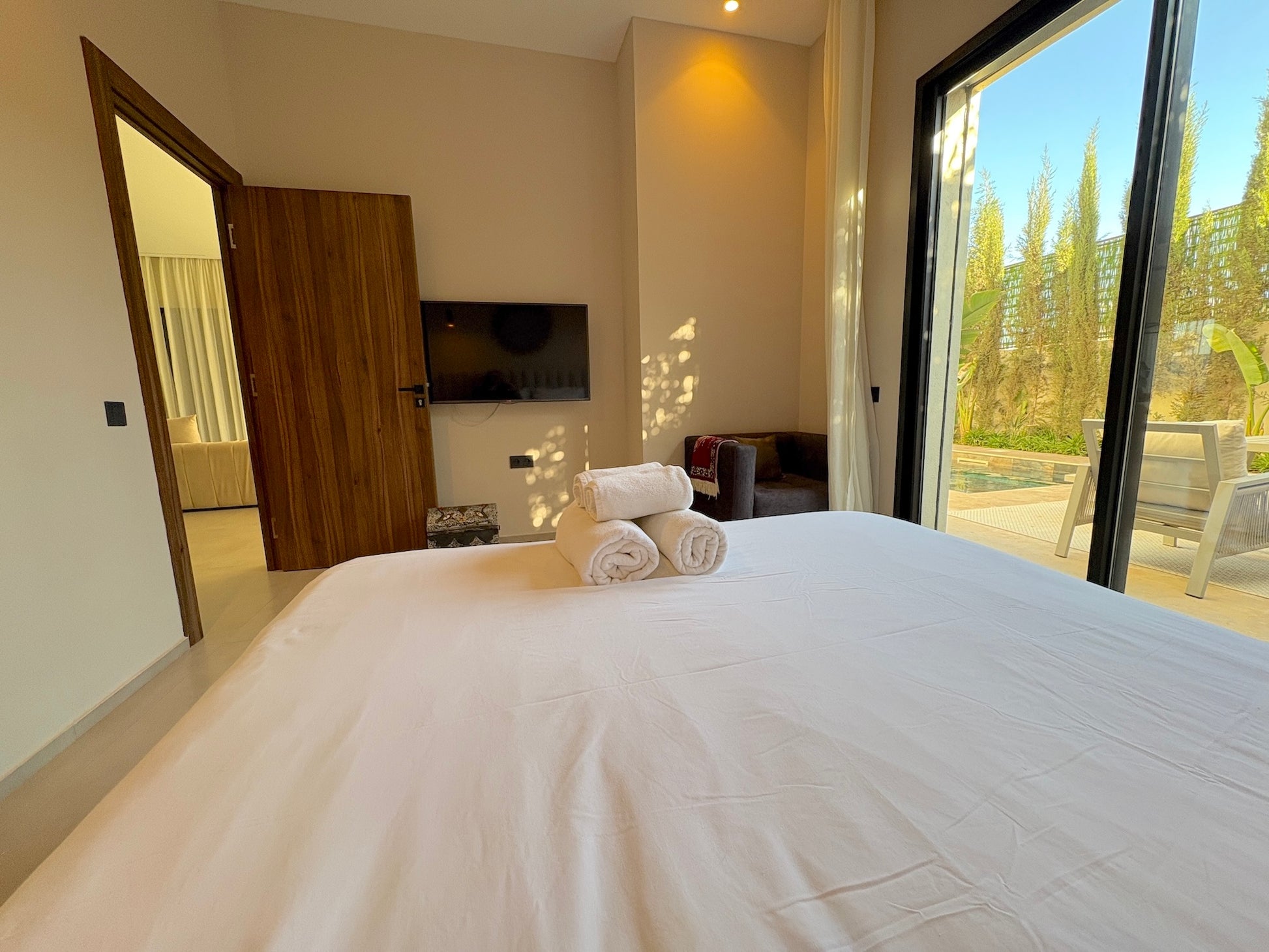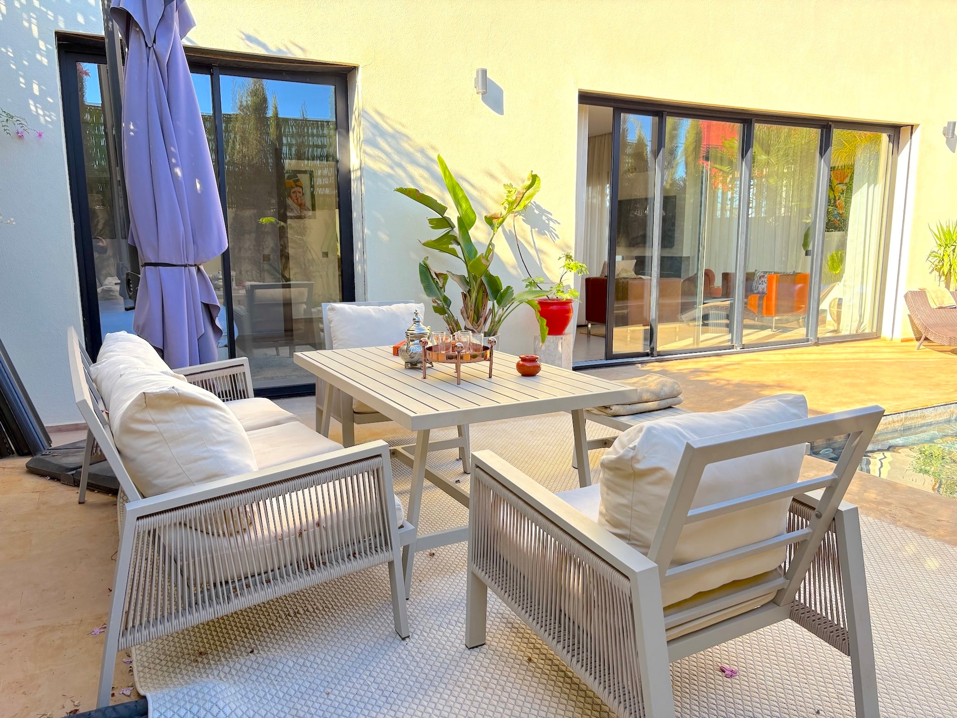 Les 4 chambres avec salles de bains privatives, le salon lumineux avec cheminée, la cuisine entièrement équipée, le Wi-Fi haut débit, le linge de maison, les draps et serviettes de bain, la climatisation intégrale, ainsi que les espaces extérieurs soigneusement aménagés avec jardin privé, piscine, chaises longues et espaces repas en plein air.